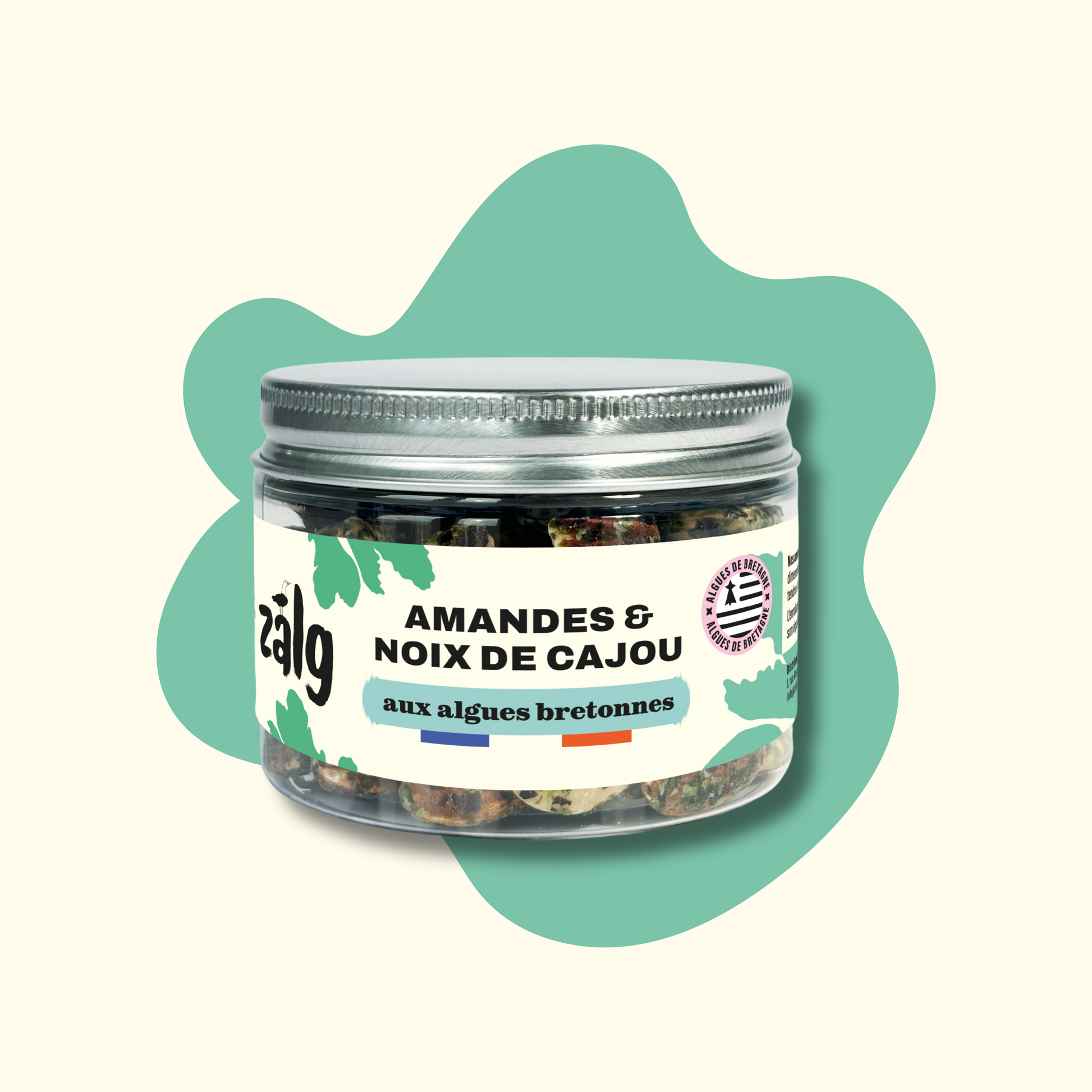 Noix de cajou, amandes, Algues de Bretagne : Dulse (Palmaria palmata), Laitue de mer (Ulva sp.), sel, miel, gomme d'accacia.
